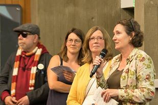 We gathered together in the Physics building in the University of Southampton. We chatted to each other and met people from different organisations and campaigns involved in climate change activity. Some superbly gorgeous canapés were provided by Goswell and Milne and we had the chance to meet campaigners and organisers from Southampton Cycling Campaign, Transition Southampton, Clean Air Southampton, Beamz (sustainably engineered wooden bicycles), Sound Cycling (cycle skills training), Greenpeace and Southampton’s Real Nappy Network. We were delighted that Joe Hudson was able to take photographs for us.